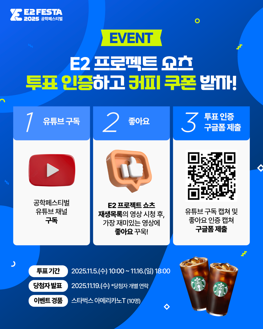 E2 프로젝트 쇼츠 투표 인증 이벤트 가장 빛나는 공학 아이디어, 당신의 ‘좋아요’로 결정됩니다 E2 프로젝트 쇼츠 공모전이란? 공대생들이 만드는 창의적인 아이디어 작품(캡스톤 디자인 작품)을 나만의 방식으로 위트있고 재미있게 소개하는 영상 공모전입니다. 시상식 일시 : 2025.11.25(화) 13:30~14:30 장소 : 코엑스 마곡 르웨스트홀(4층) 특설무대 시상 규모 : 금상 100만원(1팀) / 은상 50만원(1팀) / 동상 30만원(3팀) 투표 인증 이벤트 참여 방법 1. 공학페스티벌 유튜브 채널 구독 2. E2 프로젝트 쇼츠 재생목록의 영상 시청 후, 가장 재미있는 영상에 좋아요를 꾸욱 3. 유튜브 구독 및 좋아요 인증 캡쳐 후 구글폼 제출 투표 기간 2025.11.5(수)~11.16(일) 당첨자 발표 : 2025.11.19(수) 이벤트 경품 스타벅스 아메리카노T (10명) 이벤트 유의사항 - 본 이벤트는 1인 1회만 응모 가능하며, 중복 당첨은 없습니다. - 제출해주신 개인정보는 이벤트 종료 후 파기됩니다. - 이벤트 당첨자에게는 개별 연락 예정입니다